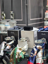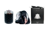 Limited-edition Herringbone candles come in a decorative herringbone glass, adorned with an elegant Côte Noire gift box with Silk feel scarf and magnetic decorative brooch.