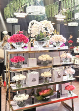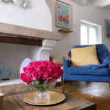Each life-like perfumed Centrepiece Rose Bud Bouquet has been skilfully hand crafted and is set in gel giving it the appearance of water. Each petal has a special natural coating to give them a true to life touch & appearance. Thirty-seven rose buds have been arranged in a luxury vase with a silver Cote Noire signature badge.