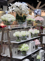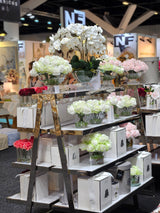 Each life-like perfumed Centrepiece Rose Bud Bouquet has been skilfully hand crafted and is set in gel giving it the appearance of water. Each petal has a special natural coating to give them a true to life touch & appearance. Thirty-seven rose buds have been arranged in a luxury vase with a silver Cote Noire signature badge.