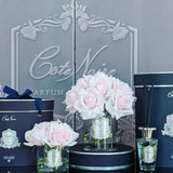 Each life-like perfumed Five Rose has been skilfully hand crafted and is set in gel giving it the appearance of water. Each petal has a special natural coating to give them a true to life touch and appearance and arranged in a clear vase with a silver signature Cote Noire badge.