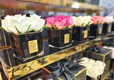 Each life-like perfumed 4 rose bud arrangement has been skilfully hand crafted and is set in gel giving it the appearance of water. Each petal has a special natural coating to give them a true to life touch and appearance. Arranged in a clear square vase with a gold signature Cote Noire Badge.