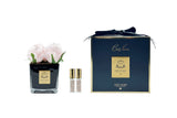 Each life-like perfumed 4 rose bud arrangement has been skilfully hand crafted and is set in gel giving it the appearance of water. Each petal has a special natural coating to give them a true to life touch and appearance. Arranged in a clear square vase with a gold signature Cote Noire Badge.