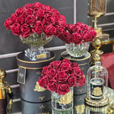 Each life-like perfumed Luxury Round Rose Bud Bouquet has been skilfully hand crafted and set in gel giving it the appearance of water. Each petal has a special natural coating to give them a true to life touch & appearance. Thirteen rose buds have been arranged in a luxury faceted vase.