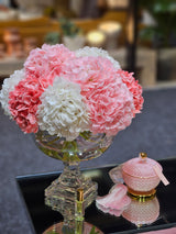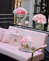 Each life-like perfumed Provence Hydrangea Bouquet has been skilfully hand crafted and is set in gel giving it the appearance of water. Each petal has a special natural coating to give them a true to life touch & appearance. Arranged in a Luxury vase with a gold Cote Noire signature badge.