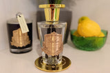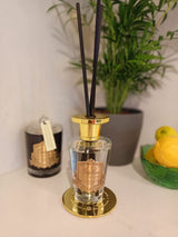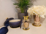 Small golden base sits under: 75 g candle Gold Badge, Votive diffuser gold Badge, Rose bud gold badge, Fragrance spray